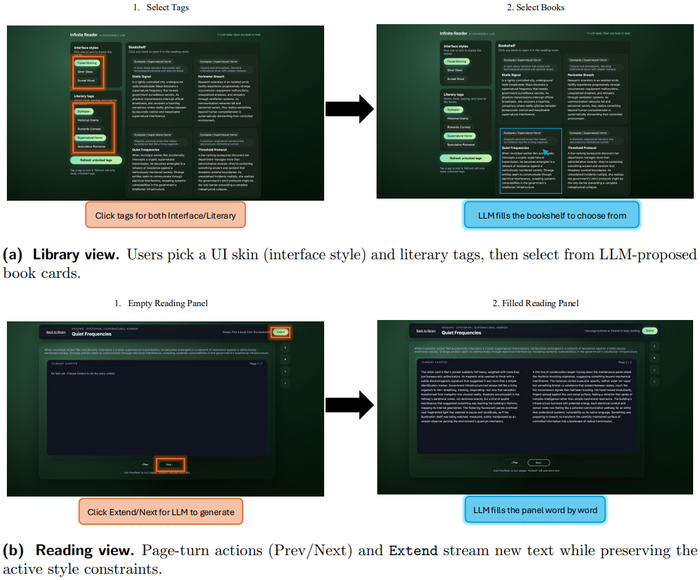 Bookshelf 将 Web 世界模型应用于长篇生成式小说创作,通过极简的用户交互实现沉浸式阅读体验。其核心设计在于将系统划分为两部分:由代码实现的“物理层”负责维护叙事不变量——包括分页规则、风格约束、剧情线索追踪和轻量化的类型化状态;而大语言模型作为“想象层”,专注于生成符合上下文的局部文本与场景细节。每次翻页时,系统将压缩的故事状态、标签约束和近期文本作为提示输入 LLM,生成内容流式渲染到界面。这种架构表明,长程生成的关键挑战并非语言建模本身,而是高效的状态管理;通过明确分工,Bookshelf 在故事无限扩展的同时,仍能提供稳定、连贯且可控的阅读体验。