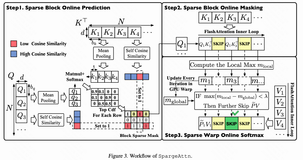 ICML2025,同样THU 朱军老师组的工作。Sparge是Sparse+Sage attention,在sage量化的基础上利用attention的稀疏性提供更好的性能。比SLA早一点,但是是更通用和完善的工作,因此放在压轴写。
