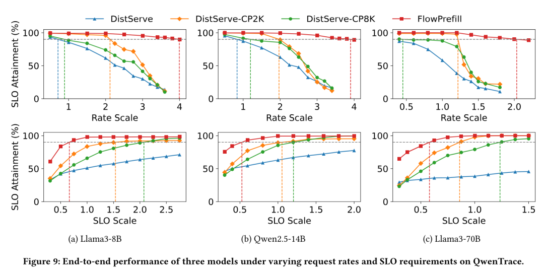 研究团队在三种模型下评估了 FlowPrefill 在不同请求速率规模下的表现。如图 9 第一行所示,随着请求速率的增加系统负载上升,导致 SLO 达成率逐渐下降,因为越来越多的请求无法满足其延迟要求。图中的垂直线标示了最大有效吞吐量(Maximum Goodput)。