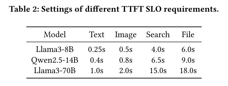 图 9 的第二行评估了系统在不同延迟要求下的鲁棒性。研究团队固定请求速率,并使用一个 SLO 缩放参数线性调整表 2 中的延迟目标。图9中的垂直线标示了各系统所能支持的最低 SLO 目标。