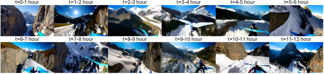 针对提示词“电影级第三人称镜头,翼装飞行者疾速穿行于狭窄的山谷之间。飞行者俯冲而下,在嶙峋的崖壁与雪峰之间流畅穿梭”生成的流式超长视频(时长12小时)。