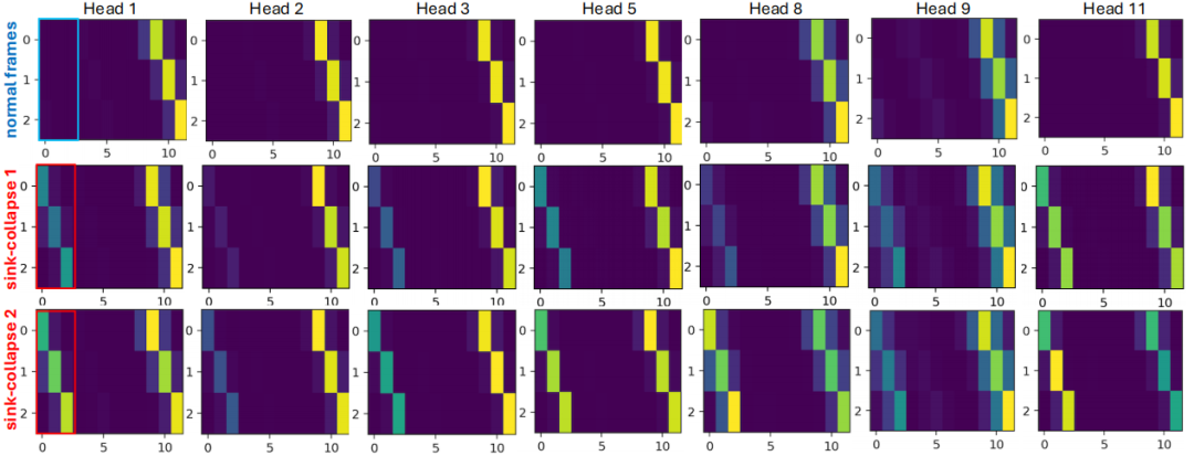 图 1 头间注意力同质化可视化结果。图中前三个潜在帧作为注意力汇聚帧,后三个为正在生成的帧。结果展示的是同一 DiT 层和扩散步在不同帧上的表现。