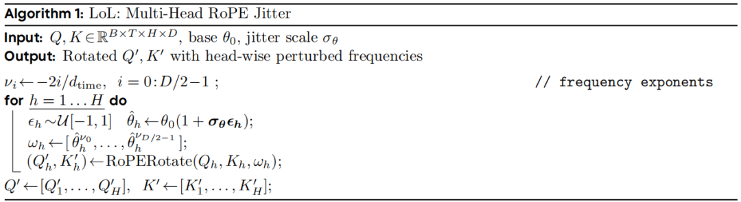 鉴于汇聚坍缩发生在所有注意力头同时表现出与汇聚帧高度相似性之时(如图 1 所示),将不同注意力头的基频偏移一定幅度,称之为多头抖动,具体算法如下。