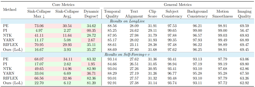 表 1 将所提方法应用于 LongLive 与 Self-Forcing++ 模型,在使用注意力汇聚帧生成 100 秒视频的场景下进行了实验。红色表示存在严重重复现象,绿色表示运动动态性显著降低。
