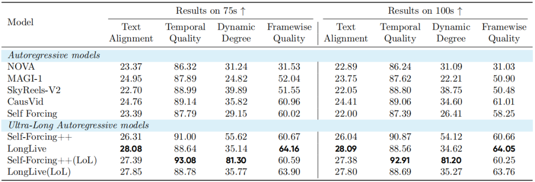 表 2 与其它自回归视频生成模型在 75 秒与 100 秒视频上的性能对比。