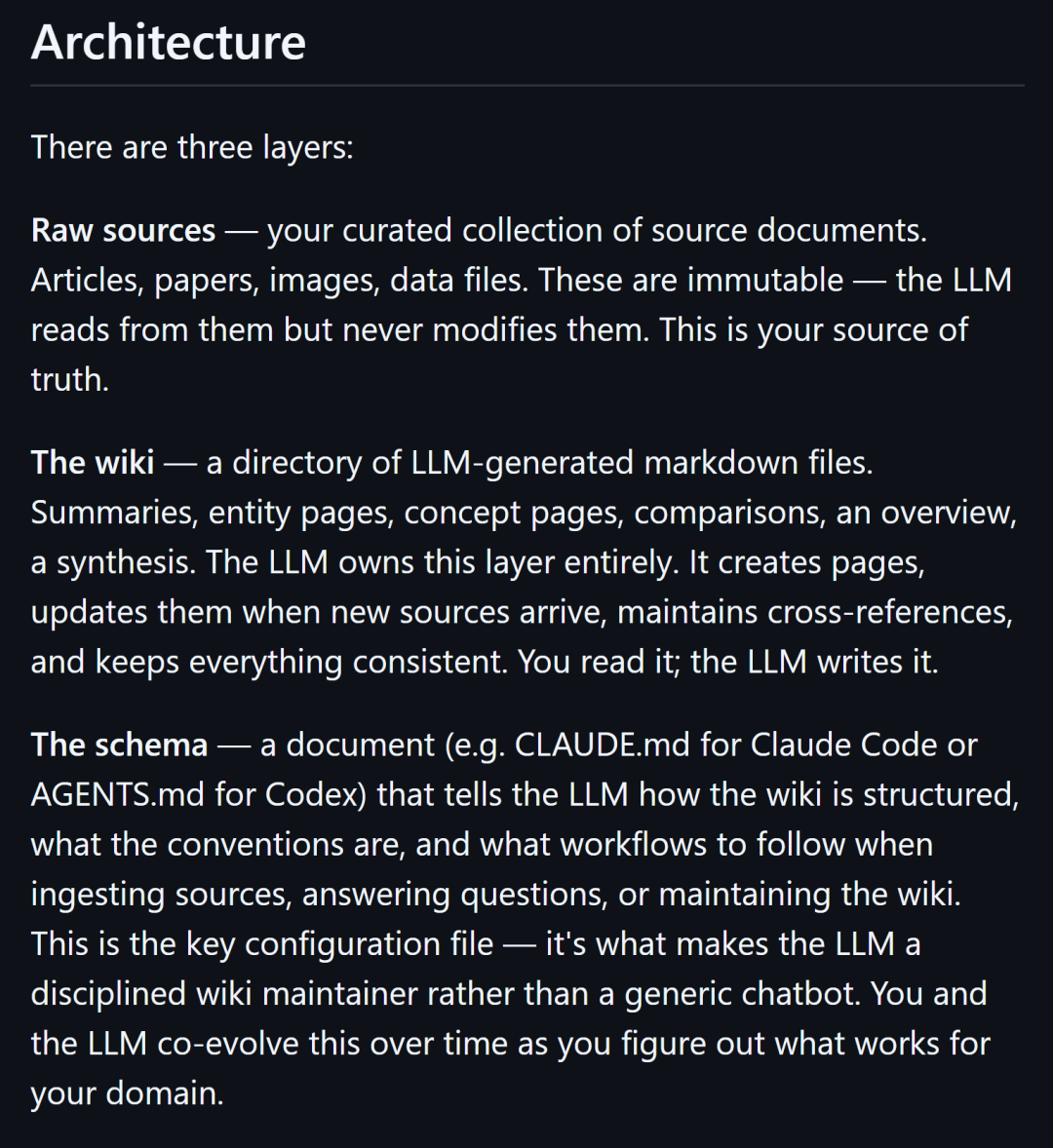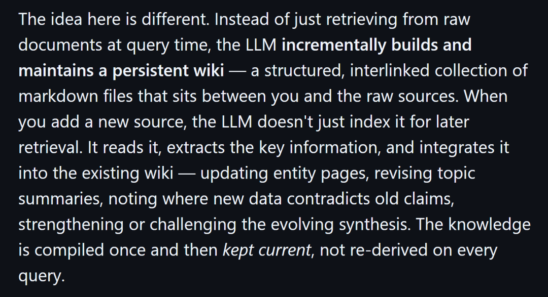 4月5日,Karpathy在Github上发布一篇名为LLM Wiki的长文,称这是“一种使用LLM构建个人知识库的模式”,文章阐述了该模式的思路。