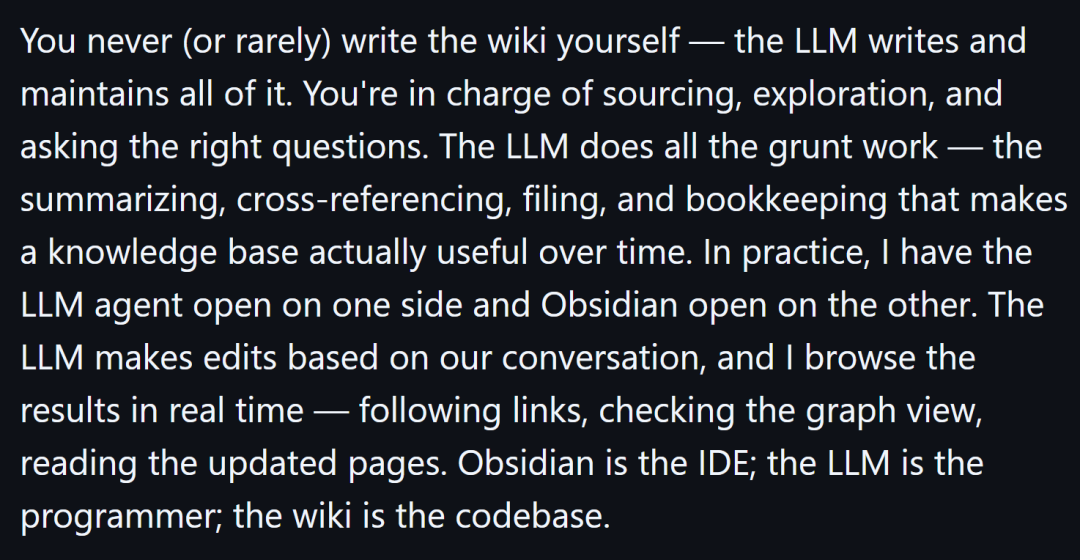 ▲LLM Wiki原文关于知识库编写与维护的部分。