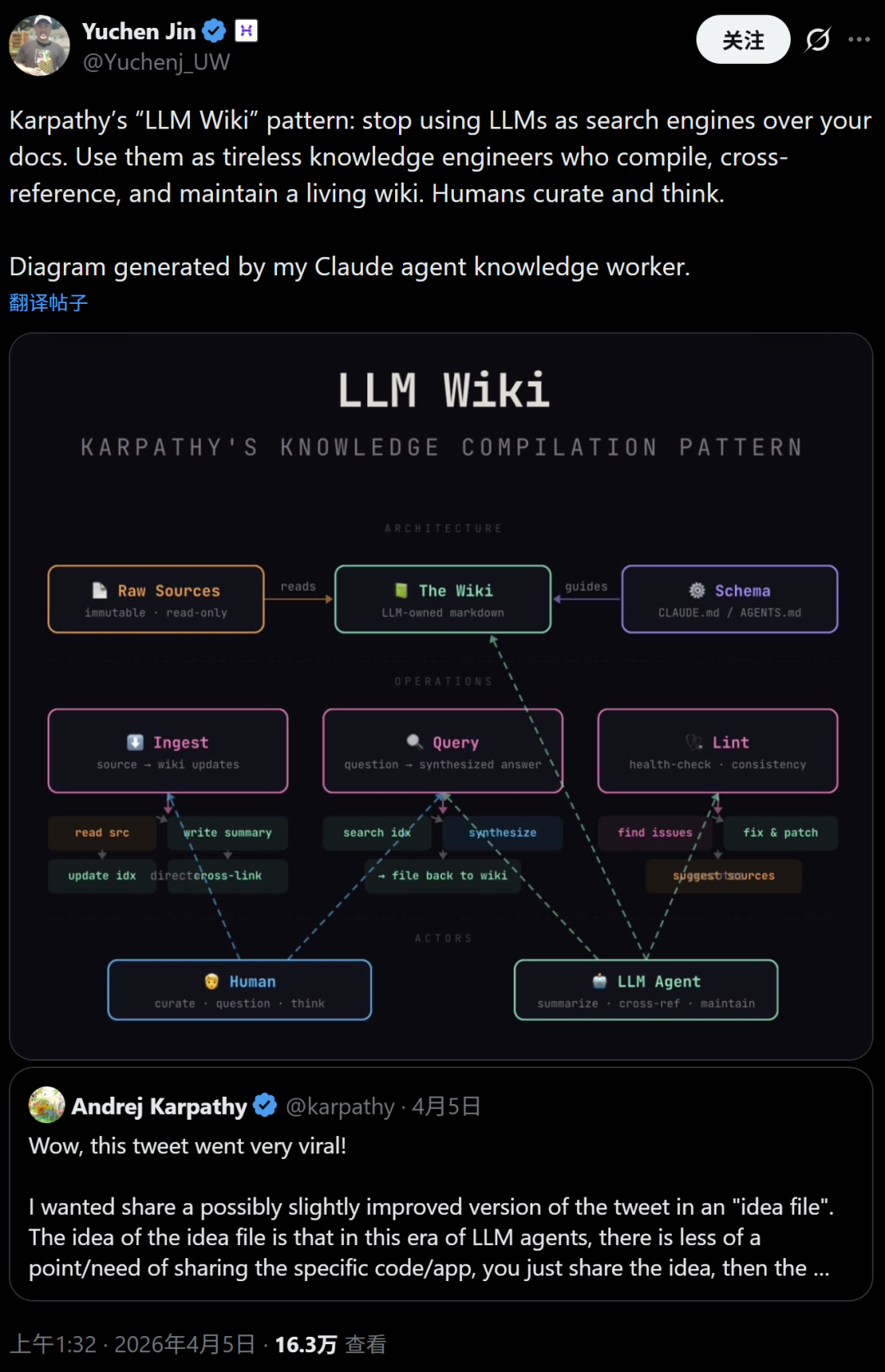 Hyperbolic Labs 联合创始人兼 CTO Yuchen Jin分享了一张LLM-Wiki 架构示意图,强调“停止把 LLM 当文档搜索引擎,用它做 tireless knowledge engineer,编译+交叉引用+维护活 Wiki”。