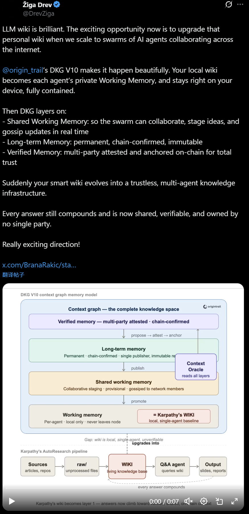 OriginTrail 联合创始人Žiga Drev发帖,称LLM wiki非常出色,并且还演示了DKG实现多智能体协作的工作记忆。