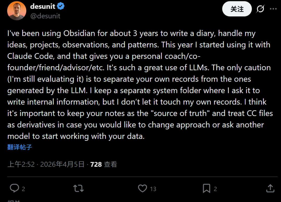 开发者Desunit在使用时建议将个人记录的信息与LLM记录的信息隔离,以防污染。