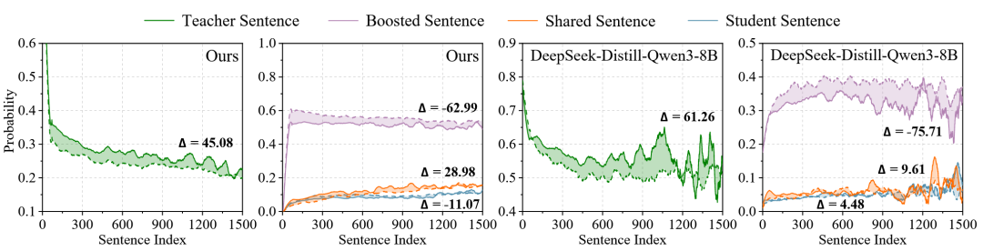 研究发现,“教师高置信、学生低概率”的句子与最终答案正确性高度正相关。因此,在数据采样阶段即优先选择此类样本,这种分歧感知采样(DAS)自然缓解了误导性梯度问题。
