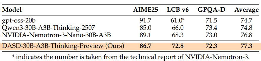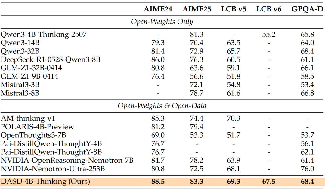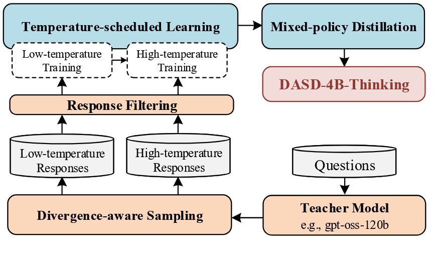 为此,阿里巴巴团队提出分布对齐序列蒸馏(DASD) 新范式,成功打造出轻量级推理模型DASD-4B-Thinking,并且通过温度调度学习、差异感知采样和混合策略蒸馏三大创新,系统解决了序列蒸馏的核心问题,仅用448K样本实现"小模型+少数据"的极致效率。在数学推理、代码生成和科学问答三大核心任务上均达到SOTA性能,不仅超越所有同规模模型,更直接碾压多个32B级大模型。目前该研究的模型权重和训练数据集已全量开源。