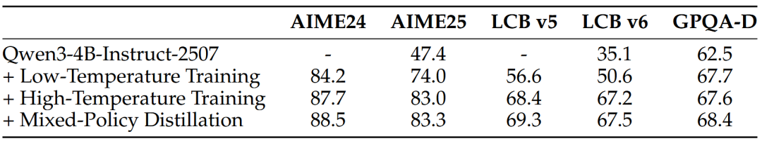 混合策略蒸馏收尾,各基准再获0.3%-0.9%增益,证明了混合策略蒸馏在以最小训练开销解决暴露偏差问题方面的有效性。