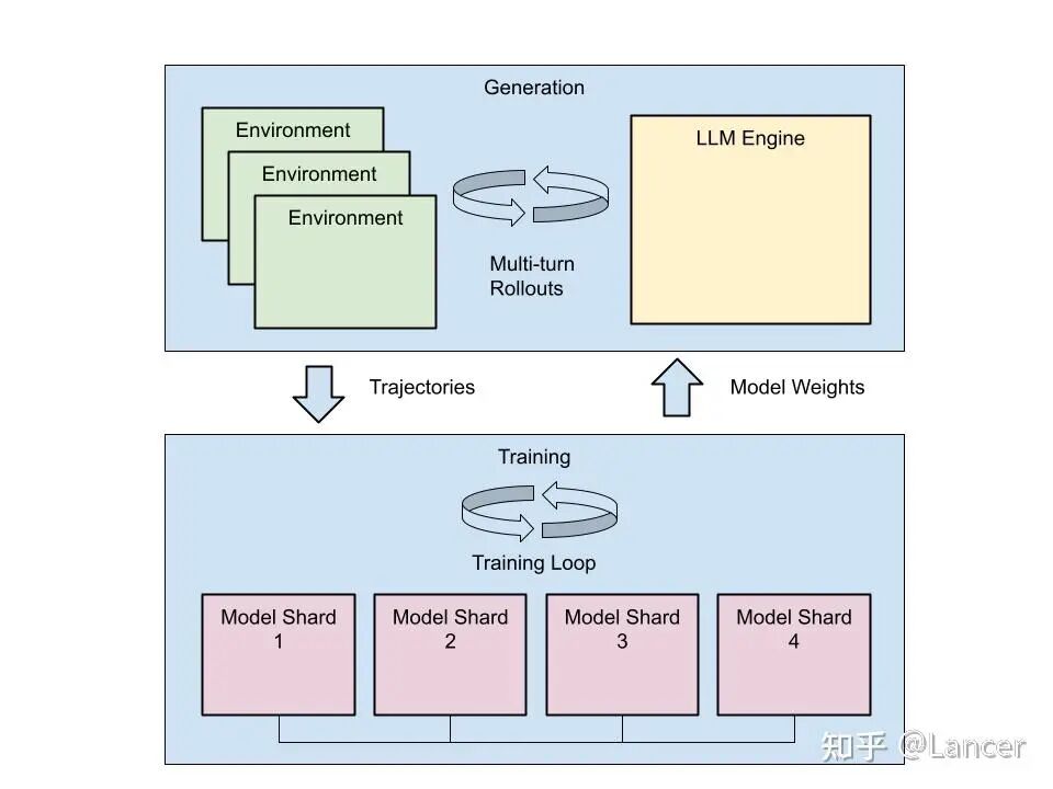 Generator:负责让LLM与环境交互,生成Trajectory并计算奖励。这是计算开销特别大的部分,其设计灵活性(如是否支持自定义采样、分支搜索)和环境抽象能力至关重要。