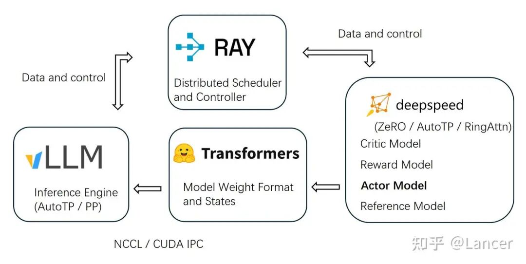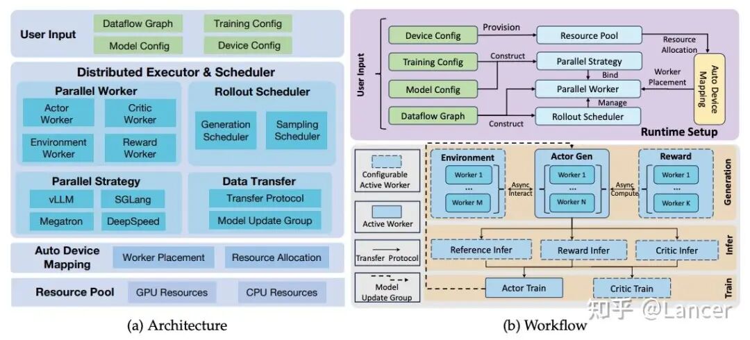 架构: 采用基于 Ray 的多角色分布式设计,将策略生成、价值评估、奖励计算等任务解耦到独立的 Worker 角色中,实现灵活的资源调度、异步训练和复杂任务编排。