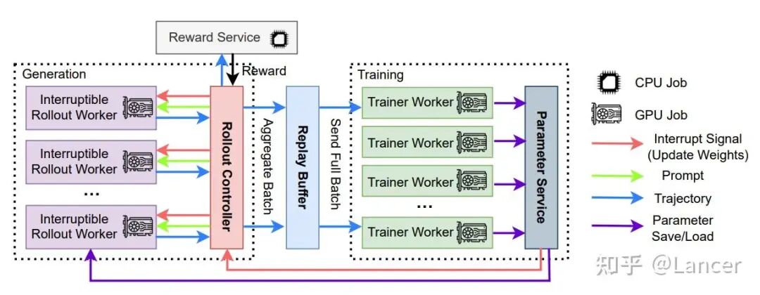架构:核心创新是完全异步设计。通过可中断的Rollout Worker、经验回放缓冲区和并行奖励服务,将生成与训练彻底解耦。