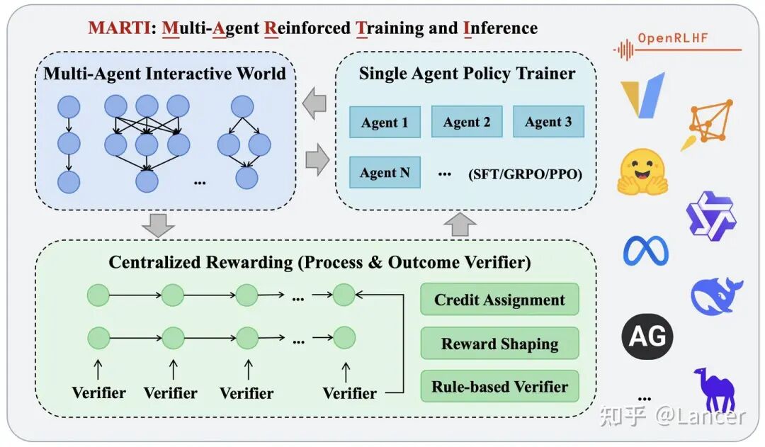 MARTI:论文作者团队(清华C3I)提出的首个高性能、开源的LLM多智能体强化训练与推理框架。通过统一框架整合多智能体推理与强化学习,结合高性能引擎与灵活架构,为复杂协作任务提供高效、可扩展的解决方案。兼容单智能体RL框架(如 OpenRLHF、veRL),支持vLLM