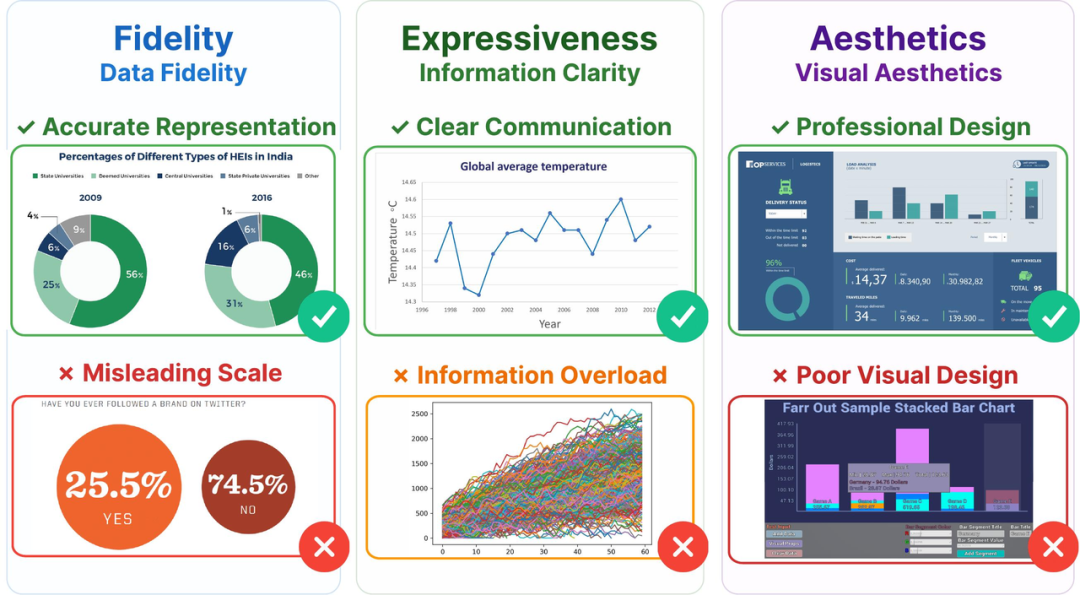 来自香港科技大学(广州)、DeepWisdom (MetaGPT) 与蒙特利尔大学的研究团队发现,严复的"信达雅"三字,恰好对应了数据可视化质量评估中最核心的三个维度: