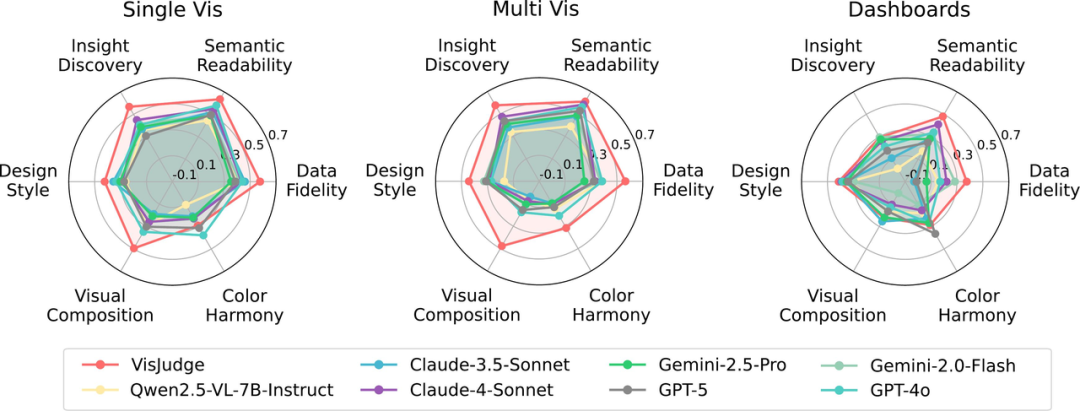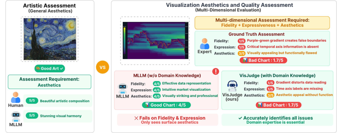 这并非个例。研究团队的系统测试发现,即使是最强的GPT-5,与人类专家的评估一致性也不足50%,几乎相当于"每两次判断就有一次不靠谱"。通用模型缺乏对可视化领域"信达雅"标准的深度理解,这正是问题的根源。