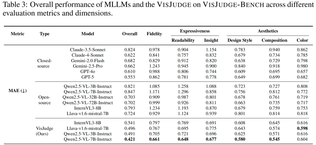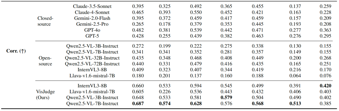 相比GPT-5,VisJudge的评估误差降低了23.9%(MAE从0.553降至0.421),与人类专家的判断一致性提升了60.5%(相关性从0.428提升至0.687)。一个仅7B参数的专业模型,全面超越了GPT-5等顶尖通用模型,甚至超越了参数量10倍于己的Qwen2.5-VL-72B(MAE 0.702)。