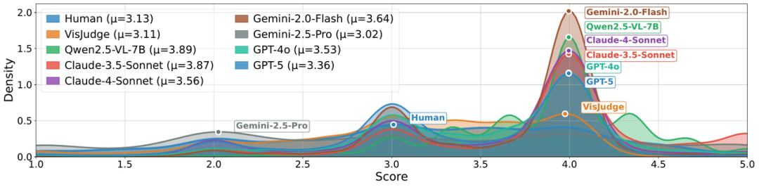 更关键的是,从评分分布来看,通用模型普遍存在系统性偏差:Qwen2.5-VL-7B和Claude-3.5-Sonnet的均值高达3.89和3.87,几乎对所有图表都"高抬贵手";Gemini-2.5-Pro又走向另一个极端,均值仅3.02,对稍有瑕疵的图表就"一票否决"。而VisJudge的评分分布与人类几乎完全重合(均值3.11 vs 人类3.13),既没有"分数膨胀"的讨好倾向,也没有"过度保守"的苛刻毛病。