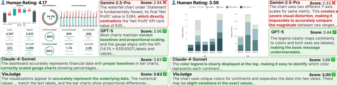 一张设计精良的财务Dashboard,人类专家给出4.17分。然而Gemini-2.5-Pro仅给出2.94分,因为一个局部瑕疵就"一票否决"了整张图,忽略了图表在数据呈现和布局设计上的整体优势。而VisJudge给出3.83分,与人类判断高度吻合。