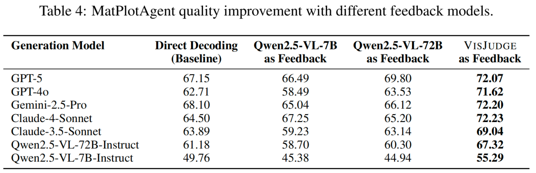 指导可视化生成: 将VisJudge作为反馈模型接入MatPlotAgent可视化生成系统,所有7个生成模型的输出质量均获得最佳表现。以GPT-5为例,直接生成得分67.15,接入VisJudge反馈后提升至72.07。而未经微调的Qwen2.5-VL-7B作为反馈时,生成质量反而平均下降2.39分,说明有偏差的评审给出的"指导意见"会适得其反。