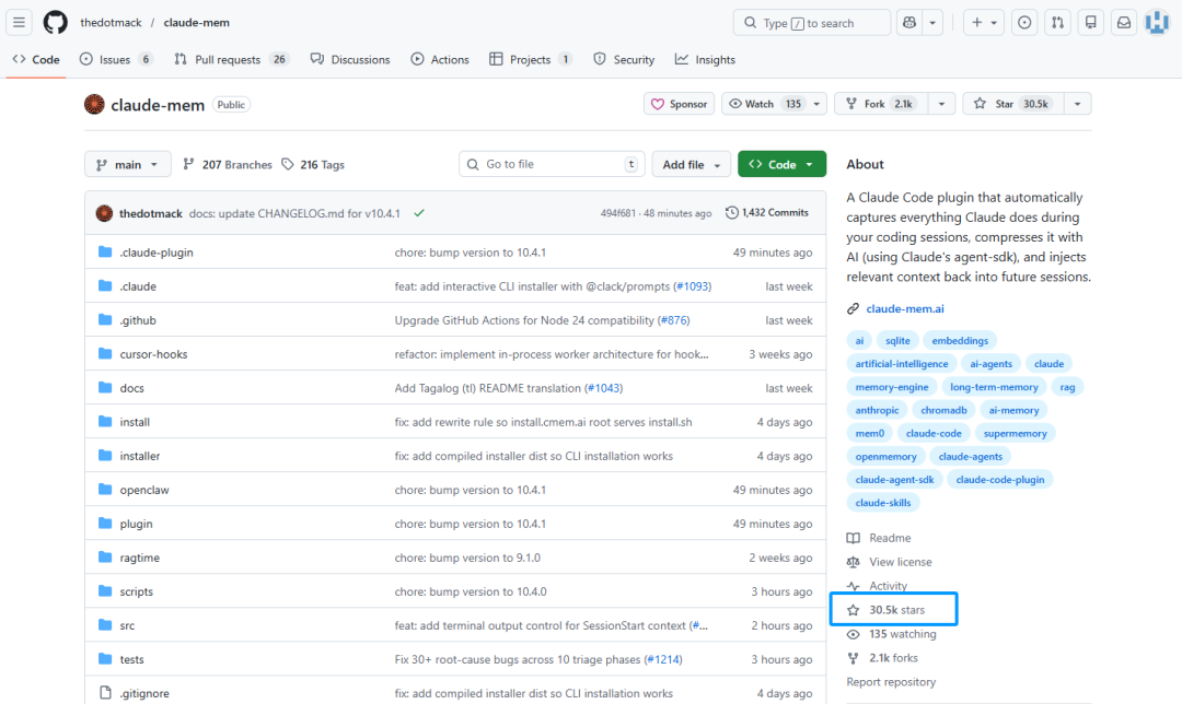 因此,今天要给大家介绍一款专为 Claude Code 打造的持久化内存压缩插件Claude-Mem,它会自动监听每一次工具调用,将输出压缩为可搜索的语义化记忆,并在需要时智能提取相关上下文。该项目在github上已收获 30.5k Stars。