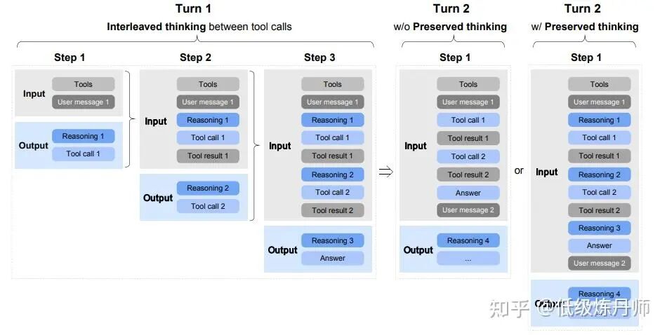 Interleaved Thinking(交错式思考):模型会在每次回复和 tool call 之前进行思考,从而提升指令遵循能力和生成质量。本质就是形成一个Thought-Action-Observation的思维链循环,相当于给后续react流程打个草稿。
