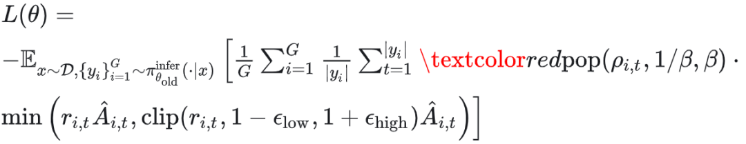 如果这个比率太偏,也就是训练策略和推理策略在这个位置上的判断差异太大,那么 IcePop 就通过这个 pop(⋅) 函数,把这类样本的贡献压低,甚至直接置零。