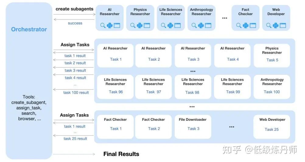 传统方法像 Hide-Tool-Result、Summary、Discard-all,本质上都是上下文太长了以后再去裁剪、压缩,是reactive 的。而 Agent Swarm 不一样,它在一开始就把长任务拆成多个语义隔离的子任务,每个 subagent 在自己的局部上下文里工作。