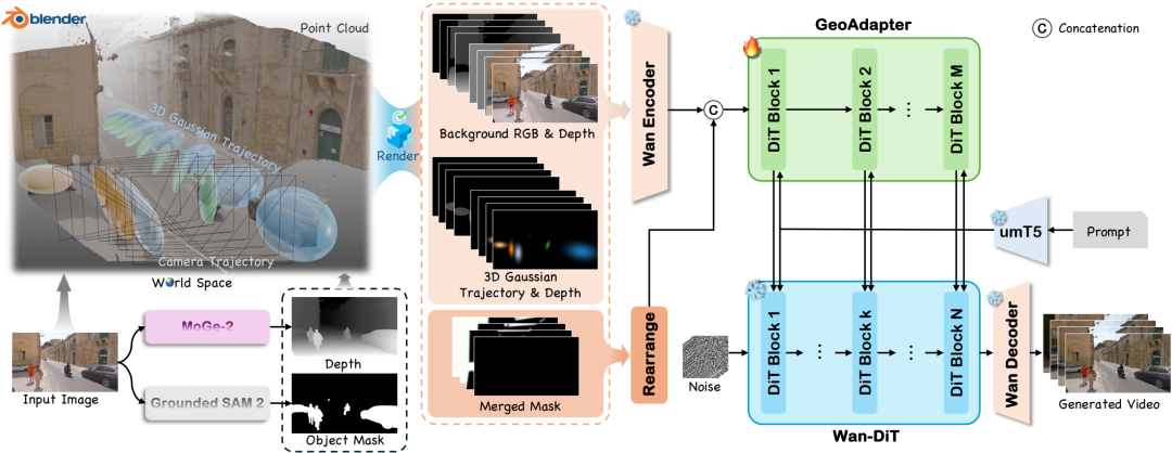图 1 VerseCrafter 框架概述。给定输入图像与文本提示,首先通过深度估计并获取用户指定的对象掩码,构建一个由静态背景点云与共享世界坐标系下的逐对象 3D 高斯轨迹组成的 4D 几何控制状态。该状态被渲染为每帧的背景 RGB/depth、3D高斯轨迹 RGB/depth 以及软控制 mask,共同构成多通道4D控制图。控制图经编码后输入至所提出的 GeoAdapter,该模块与来自 umT5 的文本嵌入共同对冻结的 Wan2.1-14B 视频扩散主干网络进行条件控制,从而实现具有精确相机及多对象运动控制的几何一致视频生成。