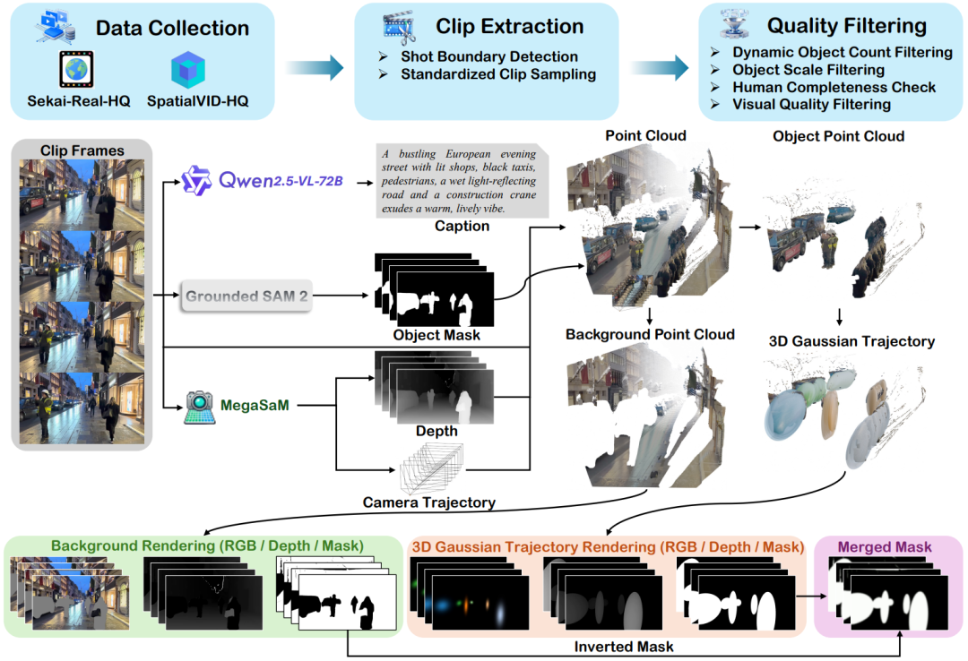 图 2 以 Sekai-Real-HQ 和 SpatialVID-HQ 数据集为基础,首先进行 81 帧视频片段的提取,随后执行质量过滤。对于每个保留的片段,通过 Qwen2.5-VL-72B、GroundedSAM2 及 MegaSAM 自动生成描述文本、对象掩码、深度信息与相机位姿。这些数据被转换为背景点云与对象点云,并拟合为 3D 高斯轨迹 ,最终渲染为背景图、轨迹图以及一个合并掩码,共同构成 4D 几何控制。