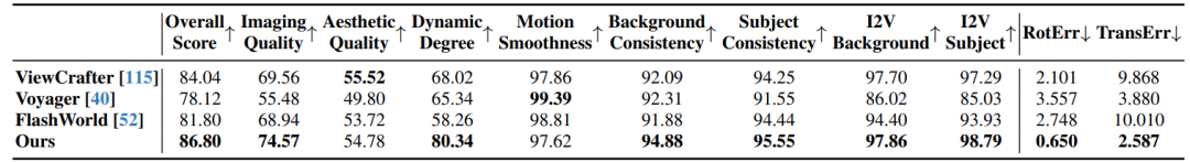 在 VerseControl4D 数据集的静态场景子集上评估仅相机控制性能,其中物体保持静止,仅相机运动。如表2所示,在综合评分(Overall Score)、成像质量(Imaging Quality)以及背景与主体一致性方面均获得稳定提升,同时保持了与现有方法相当的运动平滑性。在3D相机指标上,VerseCrafter相对于最强基线显著降低了旋转误差与平移误差,表明其在静态场景中能够更准确地遵循目标相机轨迹。