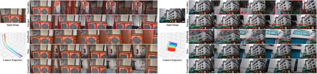 图 3 中的定性比较进一步印证了这一趋势:基线方法常出现墙体弯曲、窗户错位或沿路径视差不稳定等现象,而VerseCrafter 则保持了笔直的结构、稳定的深度关系以及与真实视频更为接近的视觉外观,证明了其在静态 3D 世界中精确的相机控制能力。