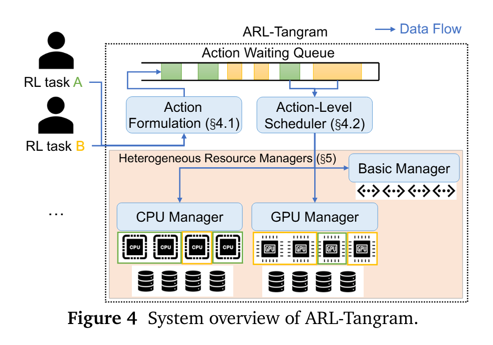 因此,研究团队设计了动作级资源管理系统ARL-Tangram(Agentic Reinforcement Learning Tangram),旨在对所有外部资源调用进行统一编排。