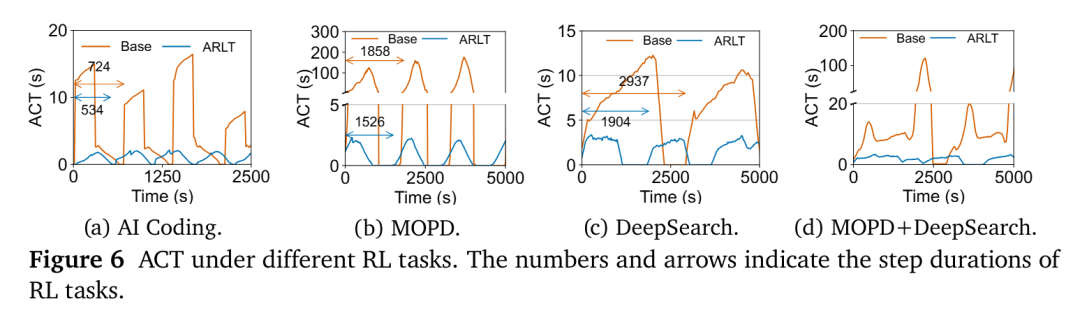 图6展示了在不同工作负载下,随着强化学习训练的推进,连续小时间窗口内的平均动作完成时间(ACT)变化。观察发现,ARL-Tangram下的ACT始终低于基线方法。这一结果表明,在相同外部资源条件下,ARL-Tangram能更有效地处理突发性工作负载,通过缓解过度配置和提升外部资源利用率来降低ACT。
