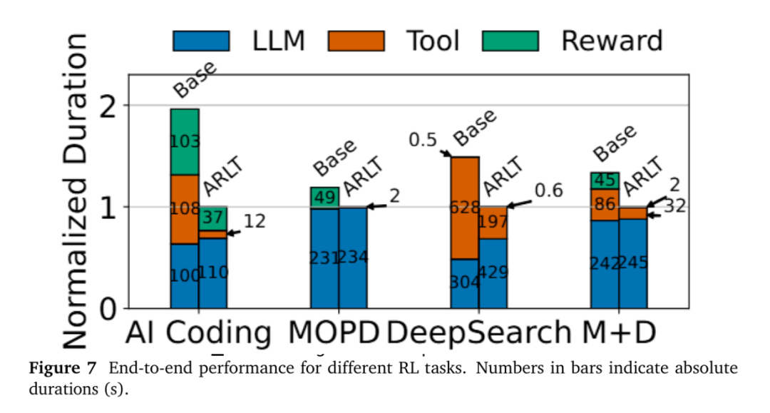 图7详细展示了轨迹时长的分解情况,进一步说明了ARL-Tangram在外部调用方面带来的改进。在AI Coding任务中,环境交互时长与奖励计算时长均显著减少,分别降低了 9.0×和 2.8×,总体降低了 4.3×。