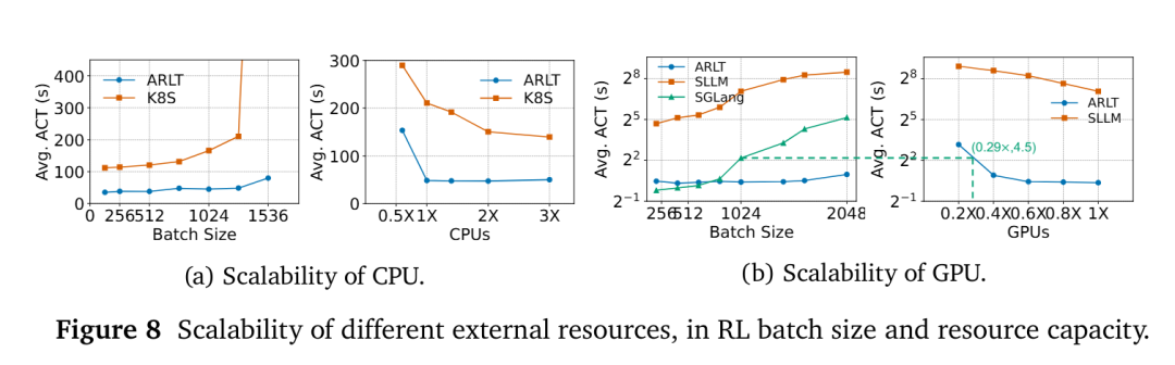 图8(b)右侧进一步突出了ARL-Tangram在固定批次大小(batch size)为1024的情况下降低外部资源成本的优势。ARL-Tangram仅需使用过度配置(over-provisioned)基线系统所需GPU数量的 29%,即可支持10个奖励服务,并实现相同的行动完成时间(ACT)。