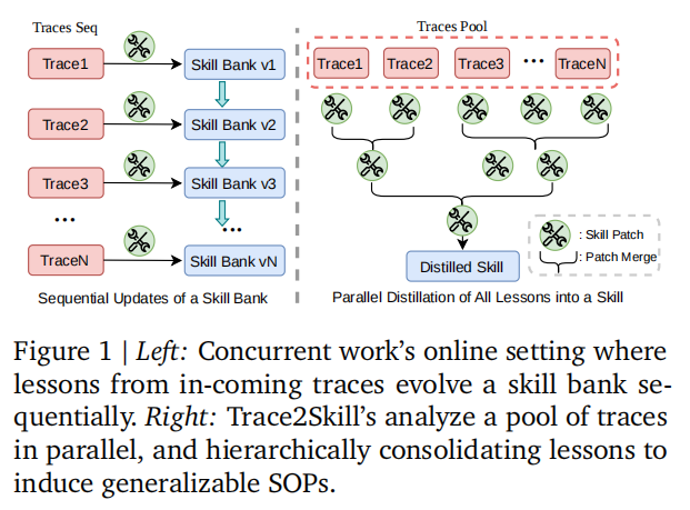 现有方法通常顺序更新 skill bank,而 Trace2Skill 改为并行分析多条轨迹,再统一蒸馏成一份技能。