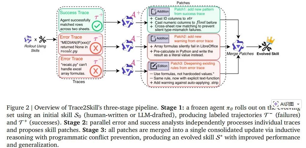 Trace2Skill 三阶段流水线概览。如下图2所示。