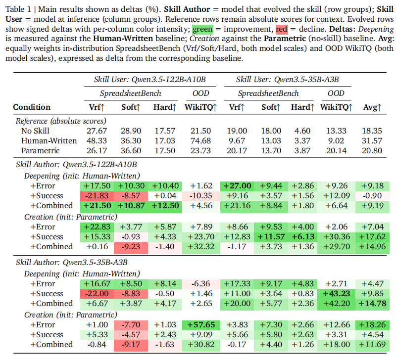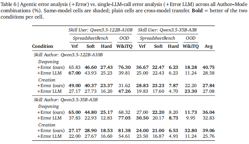 答案是可以:在SpreadsheetBench Vrf 上,122B-authored的Creation+Error提升22.83个百分点;其中最吸睛的是 35B-authored Creation +Error,当这份 skill 拿给122B使用时,在 WikiTQ 上直接提升 57.65 个百分点,达到 81.38%,甚至超过了人类写技能的表现。