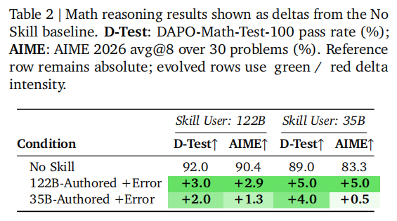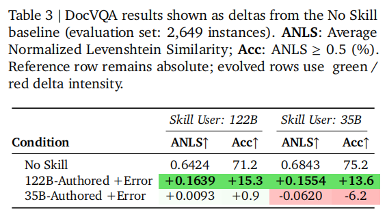 这套方法并不只对表格任务有效。数学推理实验中,122B-authored +Error skill 可让122B在 DAPO-Math-Test-100 上提升 3.0 个百分点、在 AIME 2026 上提升 2.9 个百分点;迁移给35B后,这两个指标都还能提升 5.0 个百分点。在 DocVQA 上,研究团队还发现一个很有意思的现象:“会做题”不等于“会写技能”。35B本身在 No Skill 条件下甚至比122B更强,但它并不是更好的 skill author;相反,122B-authored +Error 能同时显著提升122B和35B的表现。如表2、表3所示。