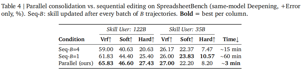 并行 consolidation 比顺序编辑更优:在122B上,Parallel 方案耗时约 3分钟,而 Seq-B=4 约 15分钟,Seq-B=1 约 60分钟,而且指标也更高。