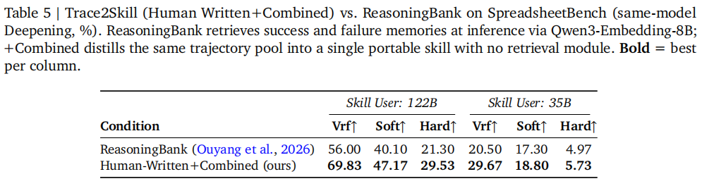 统一的 skill 文档可能比 retrieval memory 更有效:与 ReasoningBank 对比时,Trace2Skill 在122B和35B上都取得更高结果。