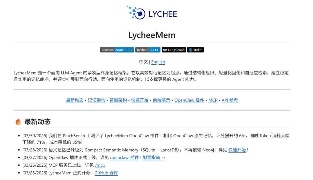 记忆不是 Agent 的附加能力,而是它真正进入复杂任务与真实工作流的底层基础设施。没有长期记忆,Agent 就只能反复依赖短期上下文;没有结构化记忆,Agent 就很难稳定复用经验;没有低成本记忆,Agent 就难以真正规模化落地。LycheeMem 的价值,就在于它把 Agent 的长期记忆,从概念探索推进到了直接可用。