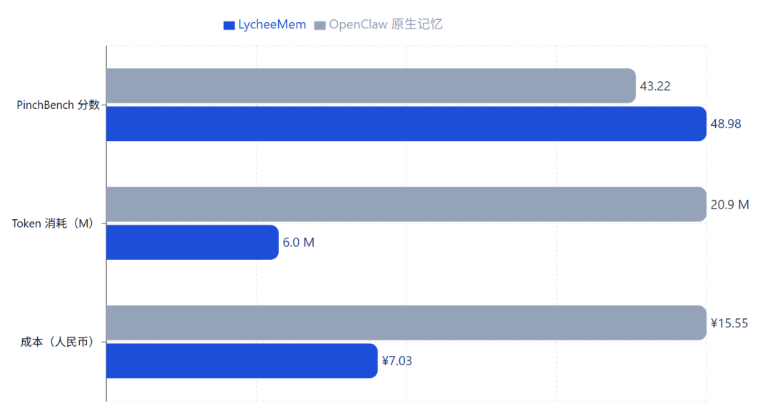 作为首个专门评测 OpenClaw Agent 真实任务执行能力的 benchmark,PinchBench 已覆盖 500+ 模型,并累计完成数千次评测运行。接入 LycheeMem 后,OpenClaw 的分数从 43.22% 提升到 48.98%,提升约 6%;Token 消耗从 20.9M 降至 6.0M,下降约 71.3%;总成本从 15.55 元降至 7.03 元,节省约 54.8%。这意味着LycheeMem 不只是记忆更强,而是在更强记忆的同时,把成本真正打下来了。