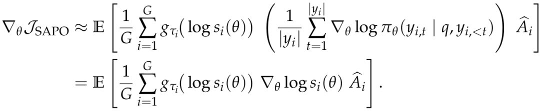 在这两个合理假设下,SAPO 进行局部线性化与序列平均近似后最终简化梯度表达式如下,