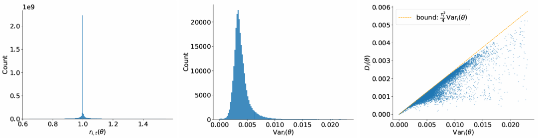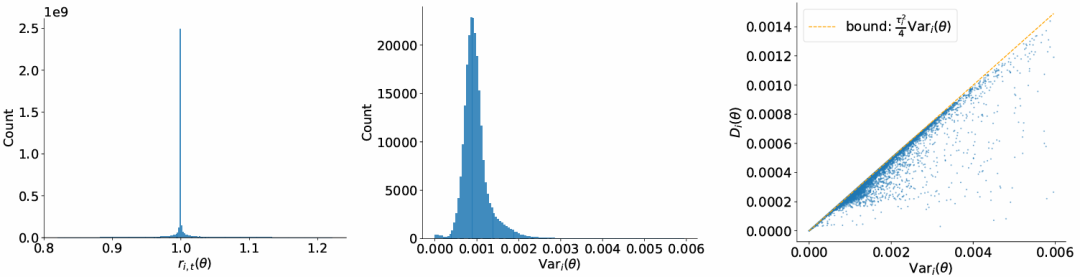 ri,t(θ) 的分布高度集中在1 附近;Vari(θ) 通常低于 0.02,其中 MoE 模型的分布略宽,而稠密模型的分布更为集中。