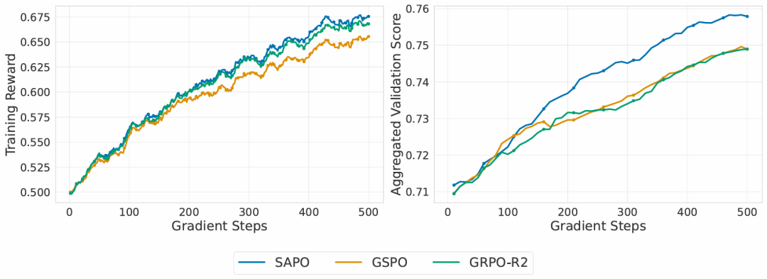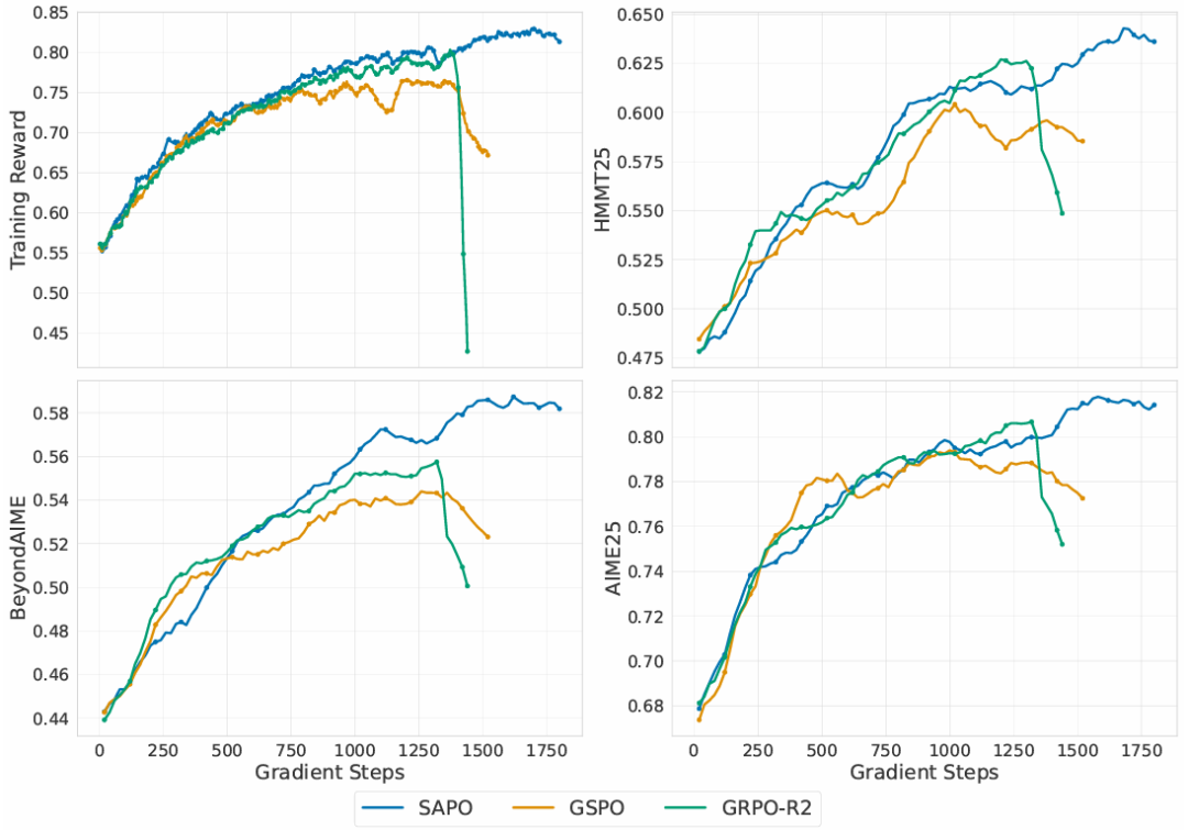 如图4所示,SAPO 在所有基准上均表现更优,训练更稳定,最终性能更强;GSPO 和 GRPO-R2 出现早期训练崩溃,而 SAPO 无需依赖路由重播即可保持稳定,降低了系统复杂度。